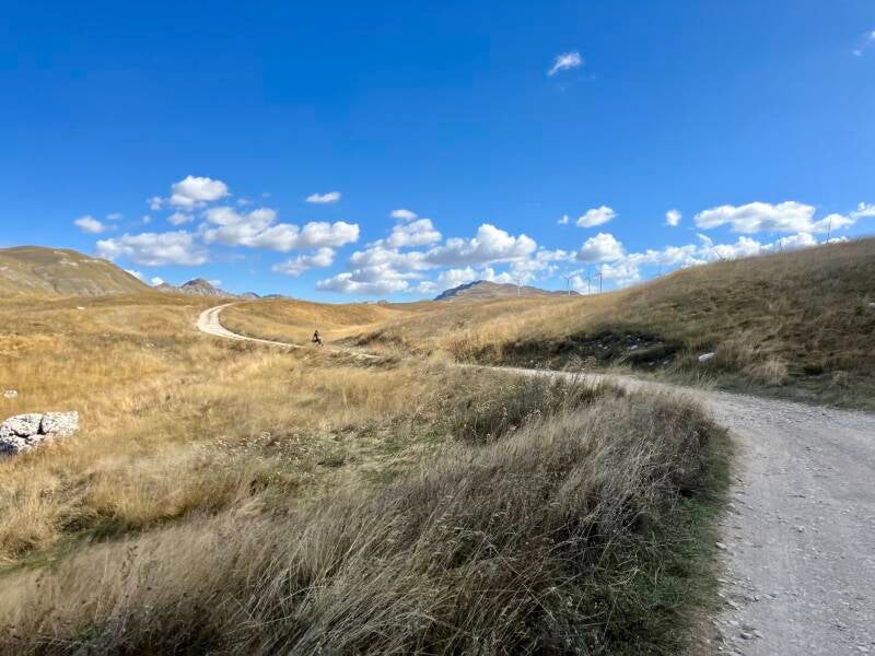 De route leidt ons naar en over een hoogvlakte, geflankeerd door bergreuzen van circa 2500 meter van het Durmitor National Park. We stoppen kort nabij Stećci bij een begraafplaats uit de Middeleeuwen die op de Unesco Werelderfgoedlijst staat maar dat is omdat we de fietsen er tegen het bord kunnen zetten, en niet omdat de plek een bezoek waard is. Op een vraag of het de moeite waard is, om ervoor om te rijden, zullen wij zeker ontkennend antwoorden.