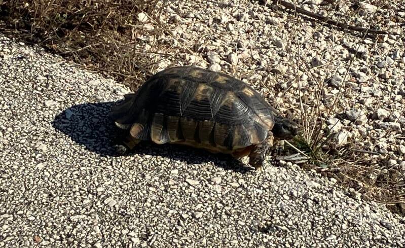 Een overstekende schildpad trekt snel zijn hoofd onder zijn schild als hij het uiterst irritante snerpende en piepende geluid hoort van Roelie's schijfrem.