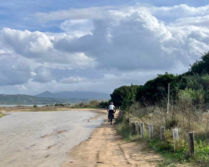 De volgende morgen fietsen we door hetzelfde mooie duingebied als op het einde van de etappe van gisteren. Nu hebben we geen haast en genieten volop van de omgeving, de gravelpaden, de rust (we zien en horen niemand op een eenzame overstekende schildpad na dan) en de afwezigheid van gedumpt afval.