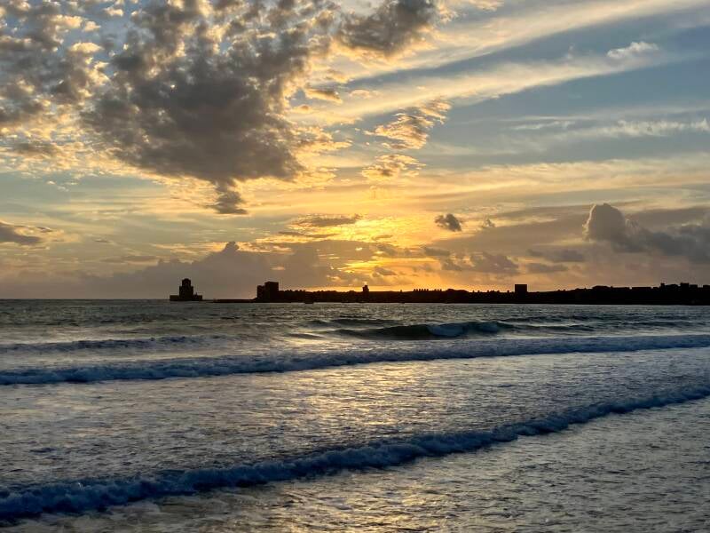 De camping ligt aan zee en is als enige van de drie campings op rij het hele jaar geopend. Het restaurant is ook hier wel gesloten dus we zullen weer op de fiets moeten springen naar een supermarkt. Er is er ene op bijna 2,5 kilometer en als we goed en wel vaart maken om daar naar toe te gaan, zien we in ons linkerooghoek bij een tankstation het woord minimarket staan met de deur open. Even binnen kijken. Ze hebben niet veel maar wel veel meer dan supermarkt met de lege schappen van eerder vandaag. Er is een zak diepvries doperwten, bacon, blauwe kaas, room en gekoelde biertjes. Daar kunnen we wel wat mee. Blij fietsen we terug naar de camping en drinken een biertje op het verlaten strand bij ondergaande zon.