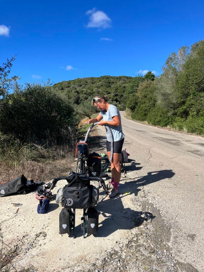 Als we de volgende dag 20 kilometer onderweg zijn krijgen we een eerste zicht op het middelste schiereiland Mani aan de overkant van waar we nu fietsen. Mani heeft hoge bergen (meerdere van >2000 meter hoog) die zowat vanuit zee omhoog reizen en het weer is helder en opnieuw perfect. Op ongeveer hetzelfde moment in de afdaling knijpt Harry z’n remmen in. Is de achterband lek? Nee, niets aan de hand, we kunnen verder. Oh nee toch niet; het is de voorband die leegloopt want er zit een doorn in. Het is de enige band die niet (meer) tubeless is en dus een binnenband heeft. Aan de kant van de weg halen we de doorn en de band eruit en willen de Albanese reserveband erin duwen, maar zien dat die een Amerikaans autoventiel heeft daar kan ons pompje er helemaal niets mee en dat dikke ventiel past ook niet door de velg. Harry vervloekt de Albanese fietsenmaker (die hij overigens destijds de hemel inprees) want hij vermoedt opzet omdat de beste bebaarde man er op aanstuurde dat we onze eigen reserve binnenband (met Frans ventiel) gebruikten. Gelukkig hebben we al in Tsjechië naast deze reserve binnenband ook een plaksetje gekocht omdat ons toen volkomen onduidelijk was of de nieuwe achtervelg van Harry nog tubeless was of niet. De taalbarrière destijds noopte ons tot die extra investeringen, maar dat komt nu wel heel handig uit. Het gaatje is gemakkelijk te vinden en te plakken waarna we al snel weer verder kunnen.