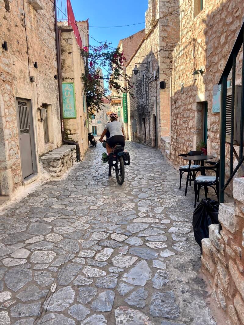 De bouwstijl is hier geheel anders dan voorheen; de woningen lijken op een mini-fort en soms hebben ze een heuse toren. Vele zijn eeuwenoud, maar ook nieuwe woningen worden in deze stijl opgetrokken. Het doet ons aan Ushguli, het bergdorp in de Kaukasus denken. Iets verder dan halverwege ligt het superleuke stadje Areópoli, dat oud, charmant en gezellig is en hoog op een heuveltop ligt. We fietsen een rondje door de eeuwenoude straatjes en steegjes en hadden hier best graag willen overnachten. Maar dit keer houden we ons aan het routeplan en fietsen door.