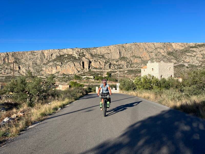 De volgende dag belooft weer een mooie te worden, zeker qua weer maar naar verwachting ook qua route. We fietsen verder langs de westkust naar het (bijna) uiterste zuiden van het schiereiland Mani. De route is inderdaad prachtig: we houden een geweldig zicht op de >2000 meter toppen aan de linkerkant, kijken over het blauwe water en romantische baaitjes aan de rechterkant en fietsen door pittoreske dorpjes.