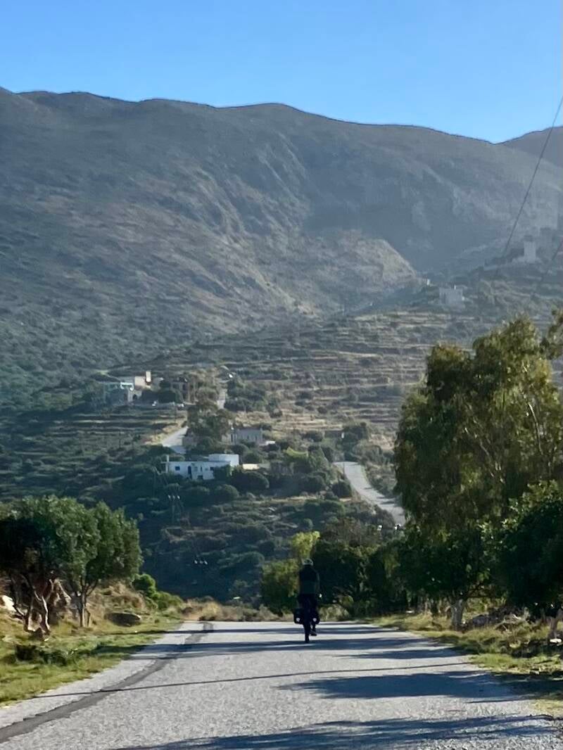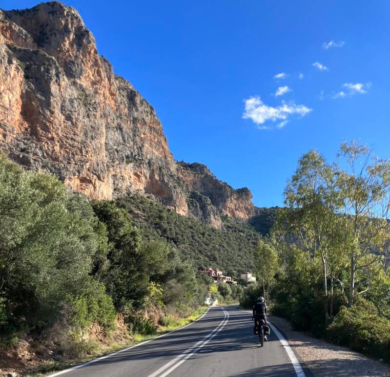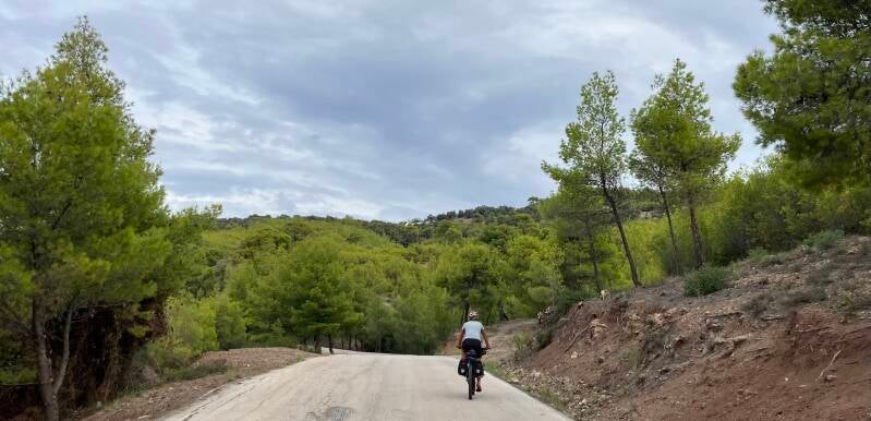 De intervaltraining met op- en afjes van de dag ervoor is een goede voorbereiding op de etappe die de we vandaag hebben verzonnen. Vandaag krijgen we weer ruim 1400 hoogtemeters voor de kiezen, maar dit keer doen we de meeste daarvan in één klim van in totaal 30 kilometer. De eerste vijftien zijn easygoing waarbij we van 0 naar 320 meter “klimmen”. De tweede 15 kilometer beloven pittig te zijn, want dan klimmen we nog eens 900 meter naar een hoogte van 1220 meter. Het doel is het bergdorp Kosmas, daar net achter de top. Maar we vermoeden dat ook dit dorp er nu verlaten bij zal liggen. We zien op internet in ieder geval dat meerdere accommodaties tijdelijk gesloten zijn. Na Kosmas kunnen we 30 kilometer lang afdalen tot aan de kust van Argolic Golf. Daar ligt een camping bij het stadje Leonidio die het hele jaar open zou zijn. Eigenlijk mikken we daarop, hoewel de optie van een overnachting in Kosmas nog open wordt gehouden.