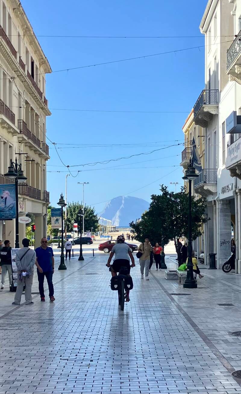 In Patras is overduidelijk veel te veel blik aanwezig. En dan hebben we het niet over het alom aanwezige zwerfvuil aan (o.a.) blik van fris-, energiedrankjes of bier, maar over auto's. Het is een chaos, ondanks of juist dankzij de vele eenrichtingswegen, die de stad in blokken verdelen. Één van die wegen is autovrij gemaakt en je ziet wat dit tot gevolg heeft: de mens (lees: voetganger, nou ja op die twee ook hier fietsende Nederlanders na dan) heeft de weg weer voor zich opgeëist. Gevolg: een en al gezelligheid, de terrassen reigen zich aaneen én zitten vol. In die straat zoeken we een plek voor de lunch en zoals zo vaak leveren de vele, vele opties enige keuzestress op en fietsen we tig keer op en neer voordat we eindelijk aan een tafeltje plaatsnemen. We hebben honger en bestellen (of krijgen) uiteindelijk veel te veel.