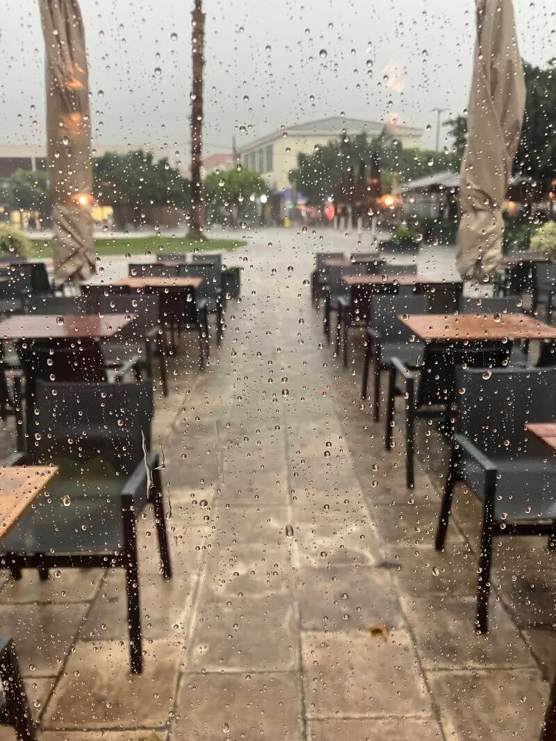 We zitten te lunchen aan het centrale plein als het onweer in alle hevigheid losbarst. In allerijl worden er op het plein parasols gesloten en stoelen opgestapeld. Het personeel raakt volledig doorweekt. Onze fietsen en tassen blijken ook doorweekt terwijl die onder een terrasoverkapping stonden, maar op een gegeven moment regende het horizontaal. Als het na een uurtje iets minder hard regent, fietsen we van het plein naar het hotel iets van 170 meter verderop en genoeg om toch zelf ook flink nat te regenen.