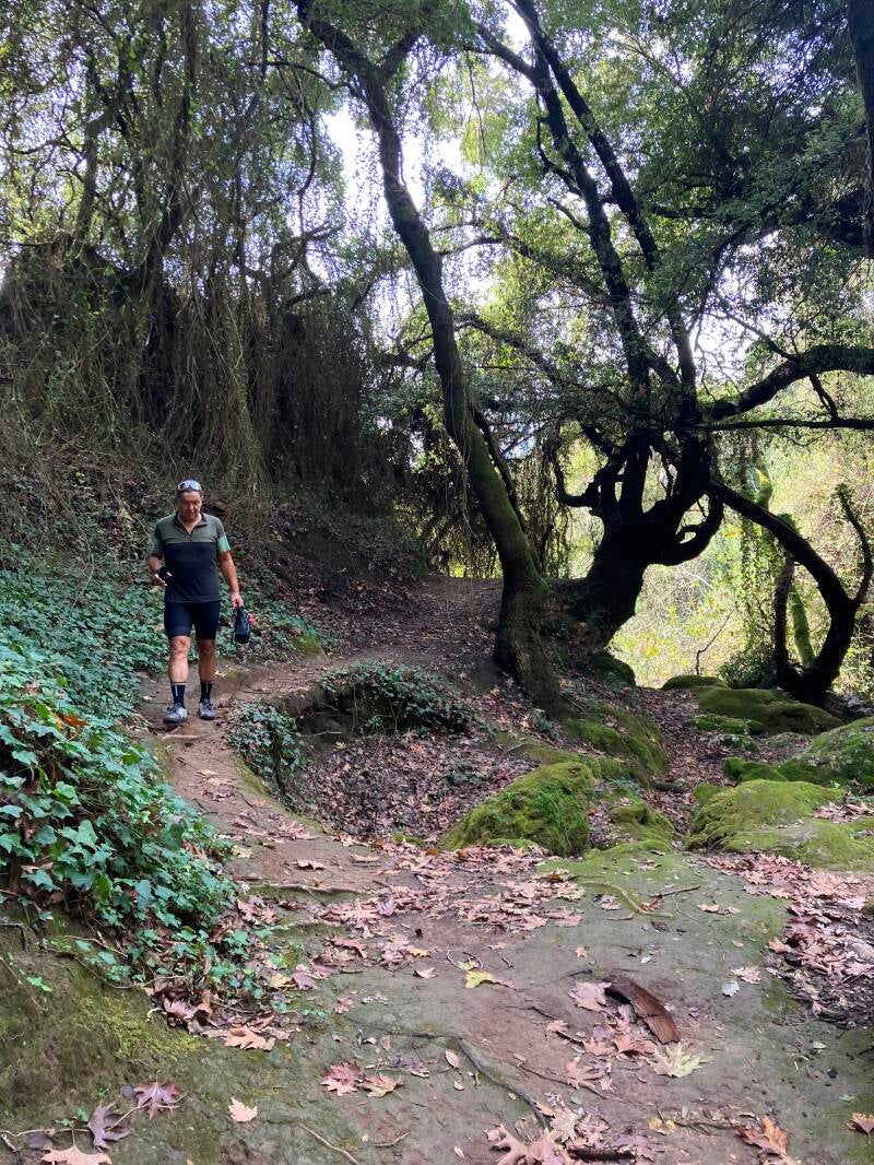Vrij veel landbouwweggetjes in Griekenland zijn geasfalteerd; gravel of onverhard komt weinig voor. De laatste kilometer van onze weg, voordat we weer de provinciale weg opdraaien, belooft onverhard te zijn volgens onze route-app Komoot. We twijfelen even als we bij dat punt zijn aanbeland: de asfaltweg houdt op en niets anders begint. Even terug hadden we al eerder kunnen afslaan naar de provinciale weg. Maar we zien een geitenpaadje en besluiten de gok te wagen; het is maar 350 meter. Die hebben we bijna alleen maar gelopen, de armen en benen onder de krassen van de doornstruiken en natuurlijk krijgt Komoot de standaard verwensingen van Harry over zich heen. Het is een wonder dat we uiteindelijk de weg weten te bereiken zonder één lekke band. Hieronder twee foto's van toen we het nog leuk vonden.