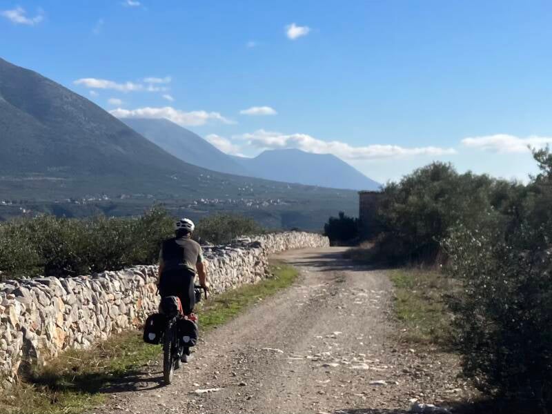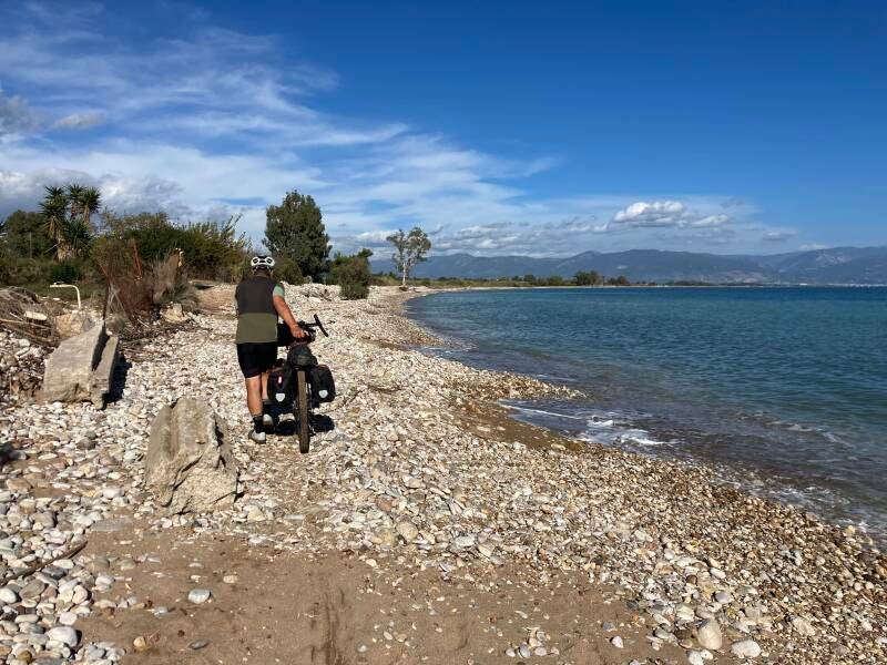 Die route is wel lang, bijna 100 kilometer met een boel hoogtemeters, maar we hebben twee nieuwe noviteiten -een helm en een zonnebril- om aan heel Peloponnesos te showen en gaan ervoor vandaag. We klimmen eerst een flink stuk door bebost berggebied om daarna af te dalen naar een vlak, uitgestrekt landbouwgebied met voornamelijk mandarijnen- en sinaasappel-boomgaarden. Op het einde van de middag -de zon staat al heel laag- scheuren we nog door een duingebied over grotendeels prima gravel, om de laatste 10 kilometer naar de camping te overbruggen. We merken dat we door een mooi gebied fietsen, maar op een of andere manier komt dat niet meer binnen: we zijn moe, de kont doet pijn en we willen de etappe afsluiten.
