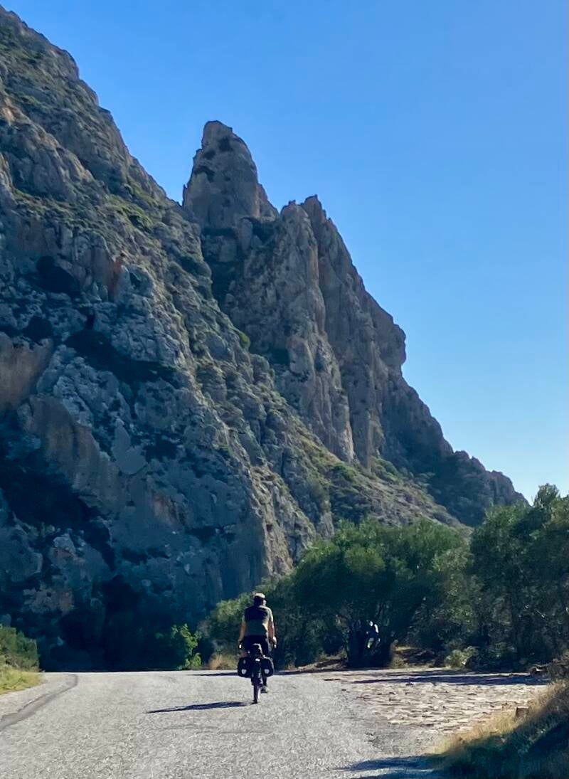 In dorpje Kotronas hopen we dan echt nog een winkel of restaurant te vinden om iets te eten, maar ook hier is alles dicht. We hebben nog een restje oud brood en smeren de laatste vache-que-rit op, nog een mueslireep als dessert en daar moeten we het mee doen. We willen graag de camping bij Gythion bereiken en dat is nog 25 kilometer en nog eens 400 hoogtemeters. Het is een soort intervaltraining met al die korte klimmetjes, maar wat we in Kotronas kauwend op taaie korsten oud brood nog niet weten, is dat de wind ons helpt en we anderhalf uur later de camping op fietsen. Dat laatste deel was trouwens ook weer afwisselend en leuk om te fietsen.