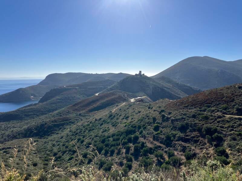 Via een paar pittige klimmetjes over een verder verlaten weg komen we in bergdorp Vatheia waar de typische torenhuisjes op een heuveltop op elkaar gestapeld lijken.