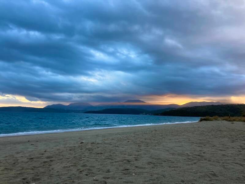 Later slingeren we tussen dorpjes Elia en Kalo Nero door een uitgestrekt duingebied waar tig campers geparkeerd staan. Dat gaat zo’n 8 kilometer achter elkaar door. Later lezen we dat dit gebied vroeger een leuke anarchistische hippieplek was en dat die inmiddels is overgenomen door publiek op zoek naar een gratis kampeerplek dat de natuur onvoldoende respecteert. Wij merken daar niets van, want wij zijn op een missie en inmiddels echt aan het racen. We kunnen het nog steeds halen voordat het onweer losbarst. Om half elf voelen we al wel de eerste druppen. Nog niet heel erg veel maar we kiezen er voor om toch nog maar een stukje op die provinciale weg te doen en de regenjas aan te trekken. Dan zijn we goed zichtbaar voor het overige verkeer. Erg druk is de weg niet. Het druppen stopt weer en zo rijden we het stadje Kaparissia binnen. We hebben het doel gehaald!