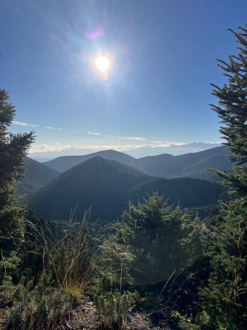 Het is al bijna vier uur als we nat bezweet en (toch) rillerig van de koude wind op de top staan. Dat is later dan gehoopt. We besluiten Kosmas eens goed te bekijken of we daar toch iets leuks vinden om te overnachten én te eten natuurlijk. Het dorp zal in het toeristenseizoen vast erg gezellig zijn, maar ligt er nu zoals verwacht verlaten bij. En we hebben ons eigenlijk weer stiekem verheugd op het kamperen. We kleden ons warm aan, de winddichte regenjassen aan, handschoenen aan en beginnen aan de afdaling, die eerst steil omhoog gaat!? Zo stijgen we eerst weer zo’n vijftig meter voordat we toch echt mogen dalen. En die afdaling is onbeschrijfelijk mooi. We worden heen en weer gegooid tussen het verlangen om hier zo lang mogelijk van te genieten en het verlangen om de camping te bereiken voordat het donker is.
