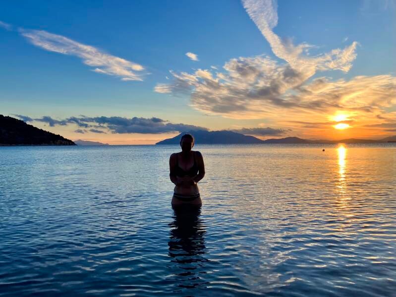 Na vijven komen we bij de camping aan die vol staat met prachtige bloemen. De eigenaresse laat weten dat het restaurant gesloten is. Dat maakt niet uit, we koken zelf een potje, gekocht bij een winkel waar drie zigeuner kinderen hardnekkig om geld bedelen. Voor een drankje is tot half zes, misschien zes uur een terras aan het strand open. In recordtijd zetten we onze tent op, zodat we nog net een biertje kunnen bestellen en nog net een laatste glimp kunnen opvangen van een prachtige zonsondergang. Wat een heerlijke dag weer!