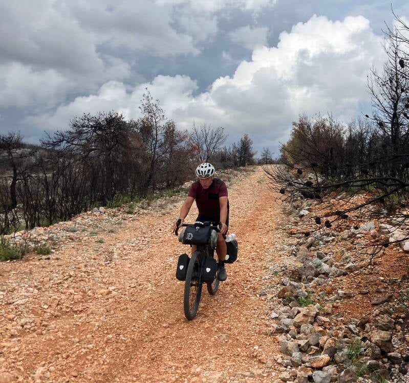 We fietsen naar het zuiden door nog veel meer afgebrande bossen. Het is verdrietig om te zien dat een zo groot uitgestrekt gebied twee jaar na de brand nog maar weinig nieuw leven laat zien. Waar we kunnen verlaten we de hoofdweg om op bospaden verder te gaan. Dat is sowieso ook een flinke afkorting en zorgt dat we in een mooie kloof uitkomen. Het pad is best een uitdaging met veel grote losse stenen, waardoor het 'tempo' bergop en bergaf rond de vijf km/u ligt.