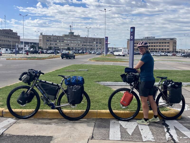 In de hal halen we de fietsen uit de dozen, zetten ze in elkaar en hangen de bagage eraan. Tijdens dit klusje wordt er al volop gezweet en worden we een paar keer geprikt door muggen. Hallo Argentijnse zomer, zullen we maar zeggen. Later horen we dat de provincie gebukt gaat onder een muggenplaag. Met de bepakte fietsen in de hand lopen we nog wat doelloos door het vliegveld en informeren tevergeefs we bij een nauwelijks Engelssprekende dame van de toerist-informatiebalie waar we geld kunnen wisselen en een sim-kaartje kunnen krijgen. In de stad, zegt ze.