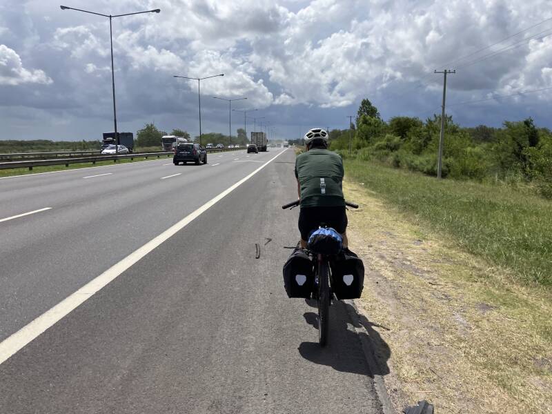We wisselen de band en gaan verder. Na een paar kilometer komen we twee Britse fietsers tegen. Ze geven ons een stopteken en verklaren dat ze de weg vanuit Rosario redelijk beu zijn en vragen ons om advies hoe naar Buenos Aires te fietsen. Nou lekker dan, we hebben dus nog een rotstuk te gaan. Maar voor hen hebben we ook weinig leuks te melden, zeker omdat een van de twee op smalle bandjes fietst en geen off-road aankan: veel plezier op de snelweg jongens!
