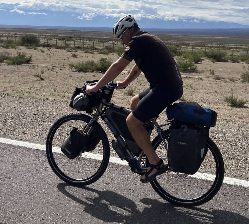 Dan is het nog een dikke 20 kilometer te gaan naar San José. Op dit stuk wordt de Ruta 40 tientallen keren doorkruist door een arroyo, een droge bedding, die ter plaatse van de weg door een soort betonnen bak wordt geleid. We zien dat de arroyo's zonder enige uitzondering allemaal pas geleden aardig wat water, zand en modder hebben meegevoerd en dat de betonnen bakken allemaal weer min of meer zijn schoon geshoveld. Roelie haat deze bakken, want het is elke keer af en op. Haar lach keert echter direct weer terug als we in de verte twee fietsers zien 'mit Gepäck', zoals wij dit altijd zeggen: ofwel met bepakking. Tot nu toe zijn we maar twee minimal bikepackers tegengekomen en dat is alweer een maand geleden. Het blijken twee jongens uit Brazilië te zijn, op weg naar Ushuaia en dan weer terug naar het noorden tot aan Mexico. Het traditioneel kletspraatje blijft ietwat beperkt vanwege de taalbarrière, maar de traditionele selfie ontbreekt natuurlijk niet.