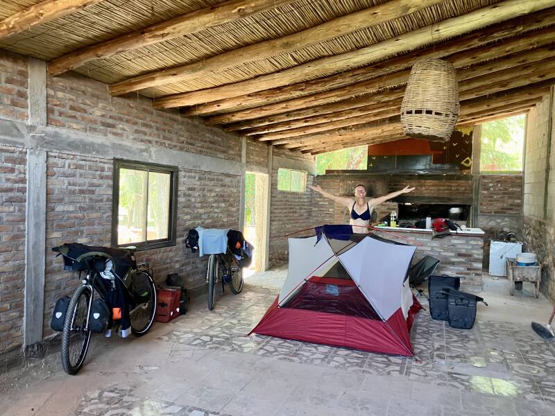 We stoppen aan de rand van het stadje bij de camping. Het zou weer kunnen gaan regenen en gelukkig vinden we een plekje onder een afdak. Het tentje past er niet geheel onder, maar soit. Onder het afdak hebben we een 'eigen' betonnen picknicktafel en naast het afdak hebben we een 'eigen' barbecue! We fietsen het stadje in om houtskool en hamburgers te kopen. Dat was in 2020 toch wel elke keer een feestmaal en daar kijken we al lang naar uit. Op de terugweg sprokkelt Harry wat droog hout en papier tussen het afval in de bermen. Eindelijk na een maand in Argentinië lukt het om weer een eigen gegrilde hamburger te maken en dat dan ook nog op een echt leuke camping. Zoals altijd druppelen de kampeerders pas wat later op de avond binnen. De camping is echter mega, dus niemand hoeft op elkaars lip te zitten. Op een paar kleine druppels na, blijft de regen dit keer uit.