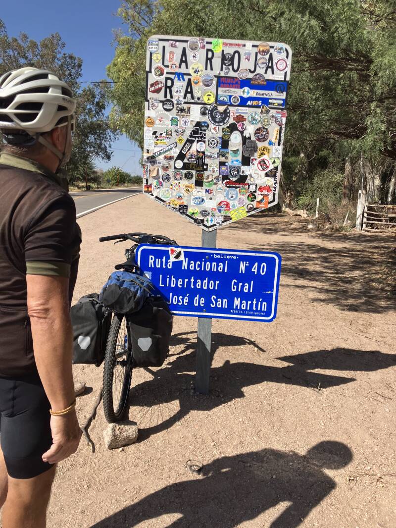 Na een maand fietsen zijn we er dan eindelijk: we zijn terug op de route die we in 2020 hebben verlaten: de Ruta 40, een populaire route van ruim 5.000 kilometer voor met name motoren, die helemaal van noord naar zuid en langs en door de Andes loopt. Het dorpje Chos Malal, waar we destijds acht weken in quarantaine hebben doorgebracht, ligt aan dezelfde weg, maar dan net even een stukje zuidelijker, zo'n 1.350 km. We hebben dus wel een stuk overgeslagen maar hebben ondertussen vanuit Buenas Aires ook (ruim) deze afstand gefietst. De borden met Ruta 40 zijn bijna standaard voorzien van vele stickers, bijna zonder uitzondering van motorrijders. Wij hebben onze oude stickers ook weer meegnomen en zullen weer gaan taggen waar we zijn geweest (wie ziet onze sticker hieronder?). Het promotieteam van Baden Württemberg moet blijkbaar nog komen om hun sticker met 'Nett hier, aber waren sie schonmal in Baden-Wurtemberg?' te plakken die we zo vaak in Europa hebben gezien. Ze moeten opschieten, want veel plek is er niet meer.