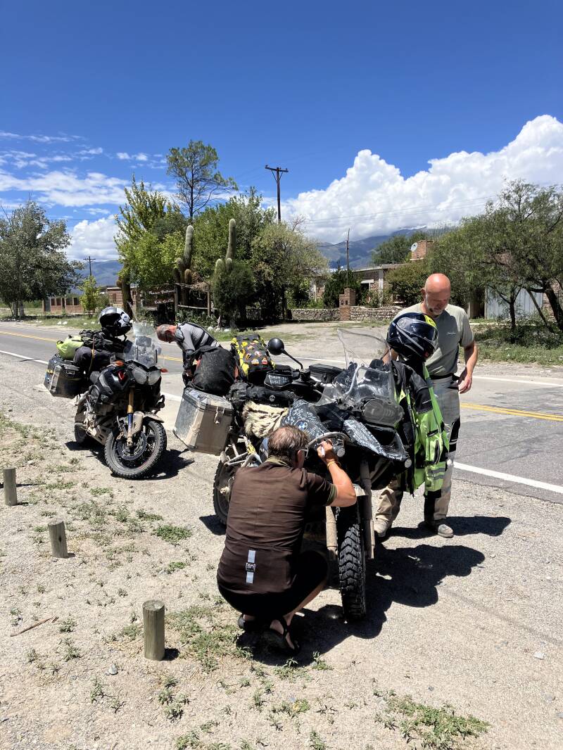 Op iets van 80 kilometer komen we de enige echte pauzeplek tegen: iets met stoeltjes, tafeltjes, een koud drankje en een hapje. We weten al dankzij Google dat het een tourist trap is en dat de beste uitbater gebruik maakt van het feit dat hij de enige is in de wijde omtrek en dus min of meer kan vragen wat hij wil. Of de beste man nu relatief een afzetter is of niet, boeit ons totaal niet, want we zijn door onze watervoorraad heen én hebben een enorme behoefte aan een ijskoud, zoet drankje én hebben honger. Het enige wat ons bezighoudt is of hij wel open zal zijn, maar in de verte zien we al dat er twee dikke motoren voor de uitspanning staan geparkeerd. Als we arriveren horen we de motormannen Engels praten met een backpackend stel en kunnen uit hun tongval concluderen dat het stel Frans is en de motormannen Nederlands. Wat leuk! We gaan bij de mannen zitten en moeten onze conclusie ietwat bijstellen aangezien Jacek Poolse roots heeft, maar Marc is een echte Hollander. We kletsen een eind weg, wisselen ervaringen en mooie verhalen uit, waaronder het gedoe met geld (vinden) in Argentinië. Wij vinden het geinig hoe het reizen per fiets en motor van elkaar verschilt: de mannen zijn pas een maand onderweg en hebben al half Chili afgewerkt en zijn nu vanaf Ushuaia in het uiterste zuiden van Argentinië naar het noorden aan het crossen. Als we afscheid nemen, pakt Marc een witte stift en vraagt ieder van ons iets op zijn motor te schrijven. Grappig.