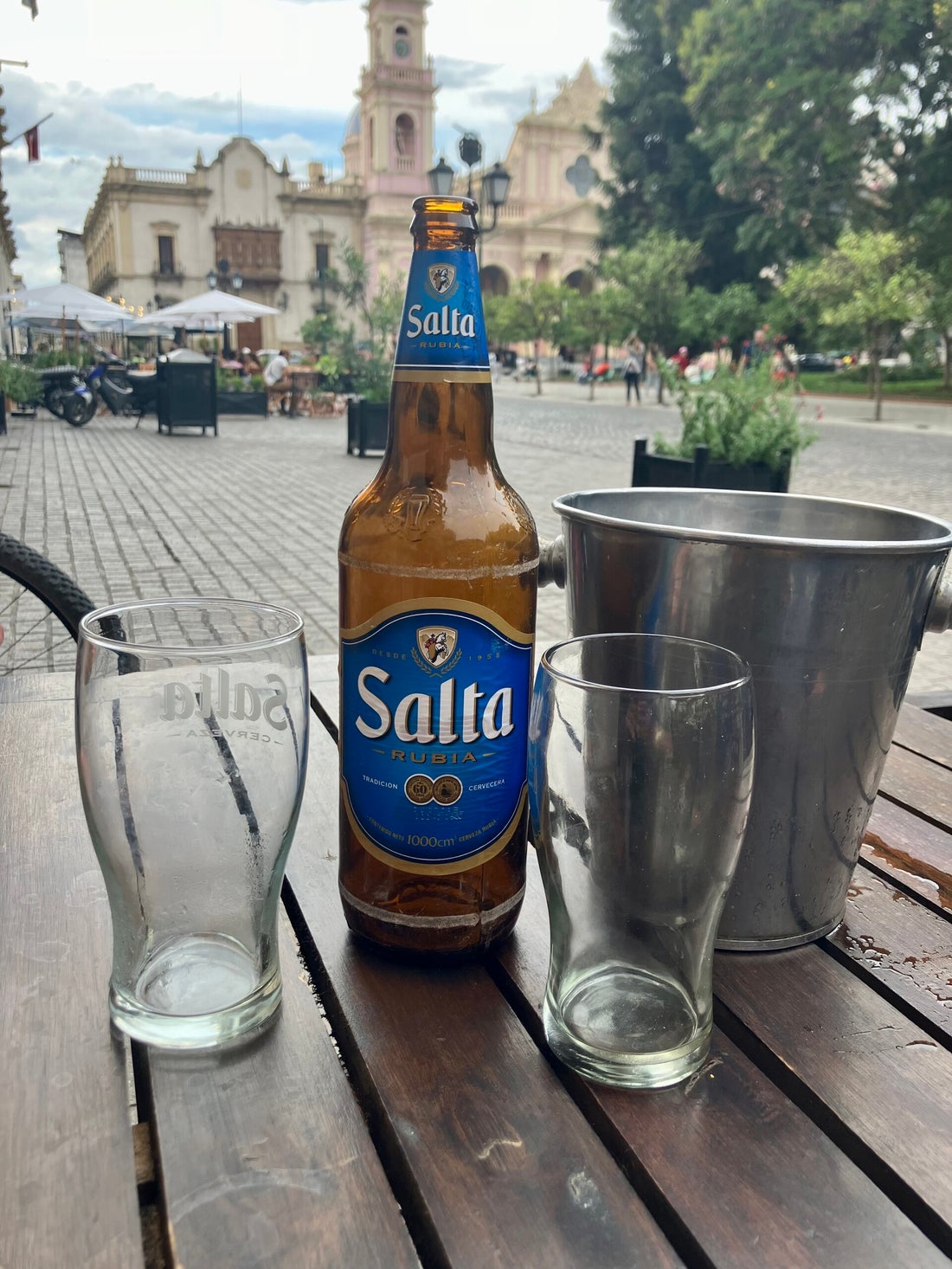 De stad Salta maakt op ons in eerste instantie ronduit een slechte indruk. Auto's en motoren geven flink gas, verlenen geen voorrang en zorgen voor onveilige situaties en de wegen zijn ontzettend slecht onderhouden, met flinke opstulpingen, diepe kuilen en gaten in het asfalt, met ongelijke betonnen platen en veel rommel en afval op de weg. We zijn blij als we in het hart van de stad, aan de Plaza 9 de Julio, op een terras zitten. Het plaatselijke bier smaakt goed (nee er zit echt geen druppel meer in) en we hebben weer een fijn appartement gevonden voor een paar dagen Salta. Hasta luego!