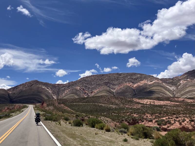 Met nog steeds de wind in de rug, klimmen we verder over de Ruta 9. Het verkeer lijkt in de middag iets minder druk te zijn. Wij hebben onze zinnen gezet op Purmamarca, een toeristisch dorpje wat hoger het westelijk gebergte in ligt, even van de Ruta 9 af. Philippe kiest er voor om nog wat langer te profiteren van de stevige rugwind en besluit verder naar het noorden over de Ruta 9 te blijven fietsen. Bij de afslag naar Purmamarca nemen we hartelijk afscheid van onze Franse kompaan van vandaag: "may the wind be always in your favor!".