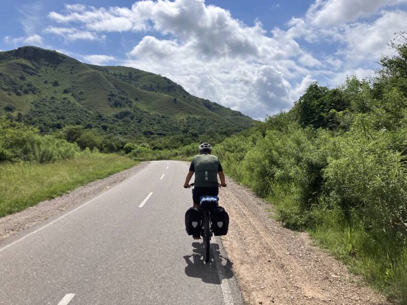 Na een kilometer of tien laten we Salta definitief achter ons en fietsen we een tijdje langs de Rio La Caldera. Langs de rivier ligt een lang bebouwd lint met veel accommodaties die zich richten op dagjesmensen en weekend toeristen uit Salta. Even later verlaten we dit dal en klimmen we naar 1550 meter hoogte. De 9 wordt ineens een stuk smaller, nog maar iets van vier meter. Het lijkt op een fors fietspad en tientallen borden geven aan dat er hier nog maar maximaal 40 km/u gereden mag worden. Er is maar heel weinig verkeer en vrachtwagens of bussen zien we al helemaal niet meer; er zullen snellere alternatieven zijn om van Salta naar San Salvador te rijden.