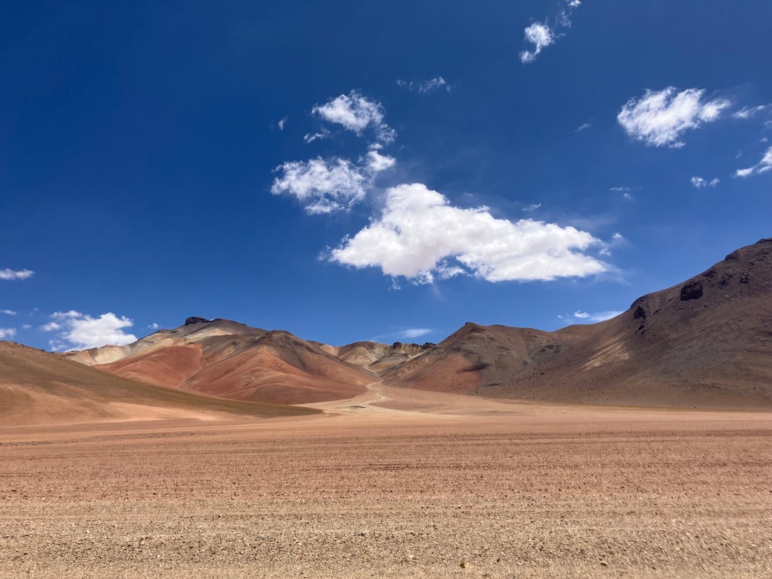 Eenmaal op de top wordt er niet gejuicht, maar geven we elkaar een ‘zuchtende box’. Veel meer krijgen we er niet uit na een killing laatste steile helling. Er volgt een afdaling, maar al vrij snel passeren we een rivierbedding en mogen we weer aan de bak een steile helling op. De stopmomenten worden steeds frequenter, soms om de paar honderd meter. Een keer of drie steken we ietwat verlegen een duim omhoog bij een passerende pick-up truck. Driemaal tevergeefs, al leek de derde even te twijfelen. Door blijven bikkelen dus en op een gegeven moment begint het geloof weer terug te keren dat we het mijnwerkersstadje Atocha wel gaan halen. Helaas pakken juist op dat moment de onweerswolken om eens heen zich samen en begint het hard te waaien.