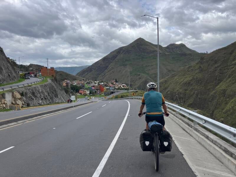 Vanuit Pedregal fietsen we opnieuw op de Panamerican voor zo'n 12 kilometer. Het is vrij rustig op deze zaterdagochtend en dat is fijn, want het gaat flink omhoog en dan is het verschil tussen ons en het gemotoriseerde verkeer groot. Alleen de zes-assers hebben moeite om snelheid te maken, net als wij dus, en dat is niet zo gek met een hellingspercentage tussen de zeven en tien procent. Ondanks het grote snelheidsverschil met het overige verkeer, voelt het niet onveilig dankzij de brede, schone vluchtstrook. Bij het dorp Tangua kunnen we afslaan naar een smalle en onverharde weg naar Yacuanquer. We laten de Panamerican achter ons en we beginnen te genieten! Na het dorp Yacuanquer fietsen we over een smalle betonstraat verder omhoog. Bij de steilere delen maakt de betonverharding plaats voor compact gravel. De totale klim is 25 kilometer en in de laatste 5 krijgen we een paar pittige hellingen en moeten we van de fiets om die te duwen. Zwaar na die 20 eerdere kilometers en bovendien gaat het ook nog regenen.