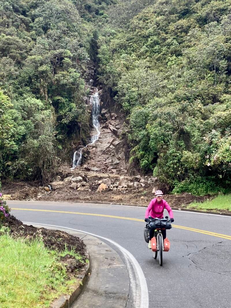 De volgende dag fietsen wij naar het dorpje Oporapa. De route is al snel onverhard, maar de weg ligt overal open en wordt geprepareerd om in de nabije toekomst geasfalteerd te worden. Zo fietsen we over een rauwe gravelweg, waar overal aan de noodzakelijke kunstwerken (met name duikers) gewerkt wordt, naar de eerste highlight van vandaag: de gigantische waterval Salto de Bordones. Deze waterval is met zijn ruim 400 meter hoogte, op één na de hoogste van Colombia. Van helaas nog best grote afstand vergapen we ons aan deze prachtige waterval, helaas is het onderste deel aan ons oog onttrokken. We pogen op deze afstand de waterval in een foto. Hieronder twee pogingen.