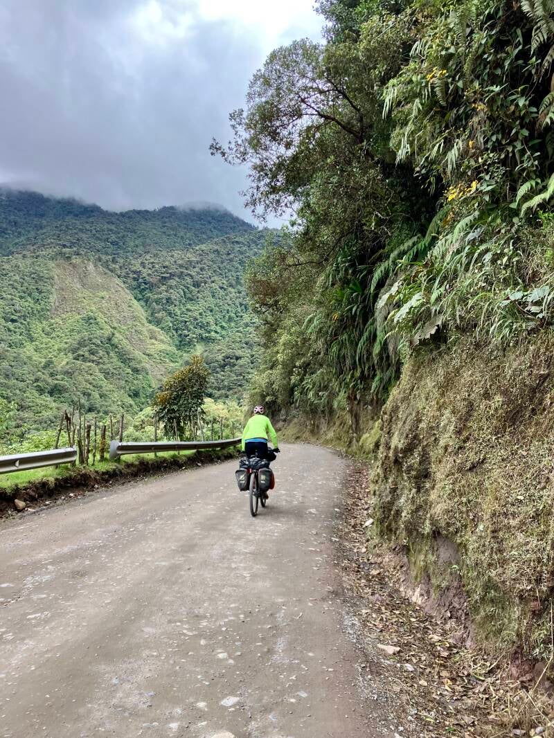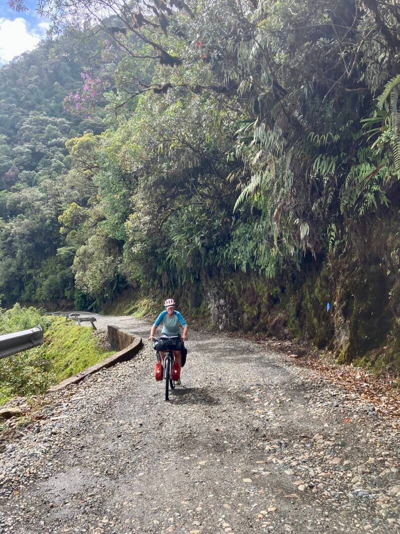 Zonder spiegeltje vertrekken we uit Pasto. Wielrennen en mountainbiken zijn populair in Colombia, maar tja, dat doe je natuurlijk niet met zo'n suf spiegeltje aan je stuur. We gaan naar de volgende Colombiaanse highlight onder fietsers en motorrijders: de Trampoline de la Muerte. We fietsen eerst naar de Valle de Sibundoy en daar doen we een dag over. Er zitten twee klimmen in de etappe. Na de eerste top krijgen we zicht op de Laguna de la Cocha en het is koud op de top. We kleden ons dik aan maar het helpt niet genoeg. Onderaan de afdaling vinden we een bakkerij met koffiemachine en binnen staat een tafeltje met stoeltje. Daar warmen we ons weer op met koffie en taartjes. Als we weer kunnen, zien we buiten een fietser aankomen, ook aardig verkleumd. Hij heet Jaime, komt uit Guatemala, gaat richting het zuiden en heeft dringend warme koffie nodig en gaat bij de bakker naar binnen. Wij beginnen aan de tweede klim en krijgen het al snel fink warm met al die extra kleren aan en die gaan dus weer uit.