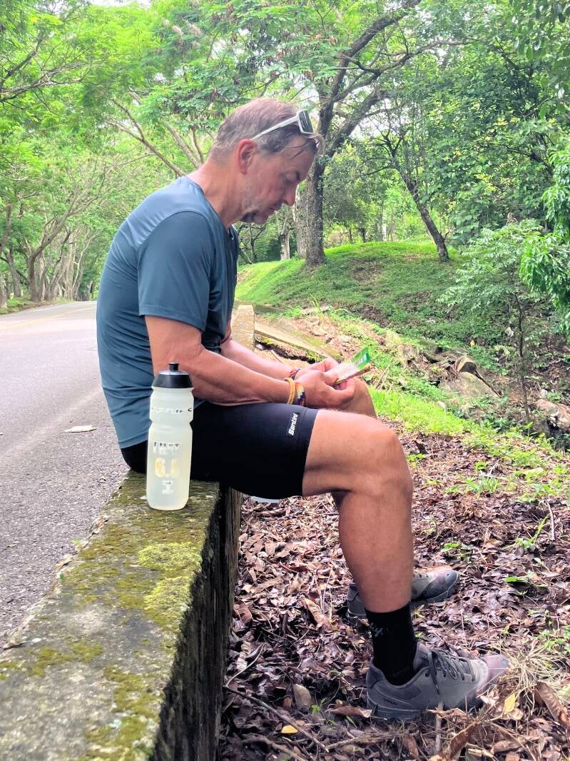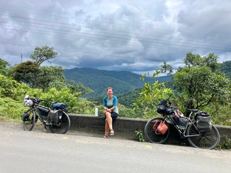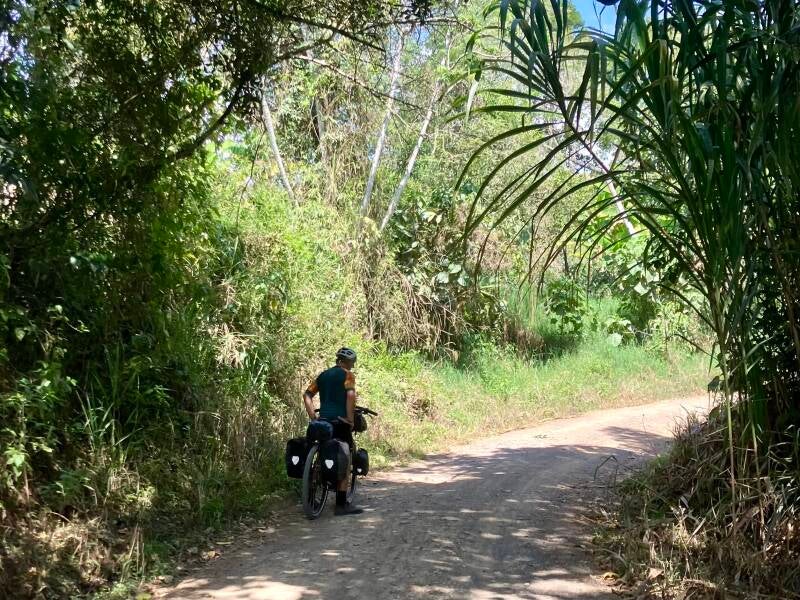 De dag erna begint wederom zonovergoten. Al bij het zadelen van de fietsen beginnen we flink te zweten. De hoofdweg is een kopie van gisteren: leuk bochtig, op-en-af, jungle links en rechts van ons en veel werkzaamheden her en der. Het verschil met gisteren is dat het vandaag (wel) gaat regenen.