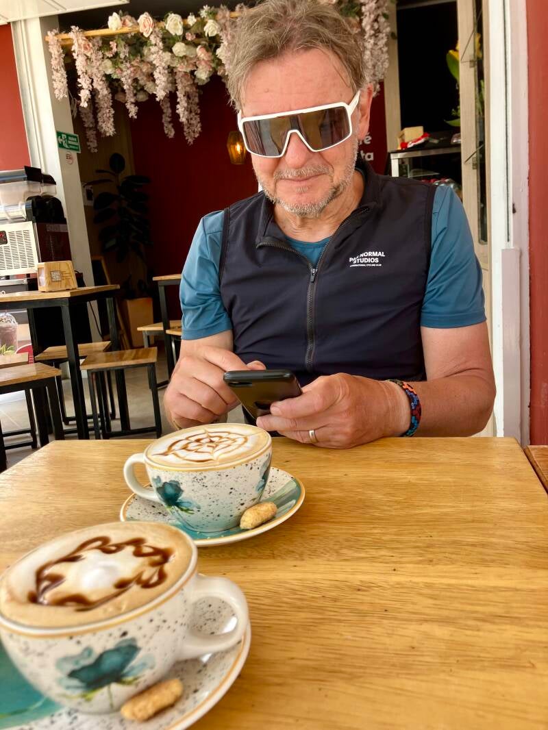We vragen aan Maria, de lief-leuke eigenaresse, of de route die Komoot voorstelt oké is gezien veiligheid. Maria is even in verwarring en denkt dat we op een militair terrein zouden doodlopen, maar dan ziet ze dat dat ergens anders is. Ze adviseert de hoofdweg en niet het onverharde weggetje "door de bergen" die we van onze navigatieapparatuur Komoot voorgesteld hebben gekregen. We vragen haar of dat verband houdt met de veiligheid, maar nee, het heeft te maken met comfort. Ons staat die hoofdweg niet zo aan en we kiezen toch voor de weg die Komoot heeft bedacht en die is leuk zeg! We fietsen tussen de koffieboerdeijen door en komen na een dikke tien kilometer helaas dan toch uit op een onvermijdelijke hoofdweg.