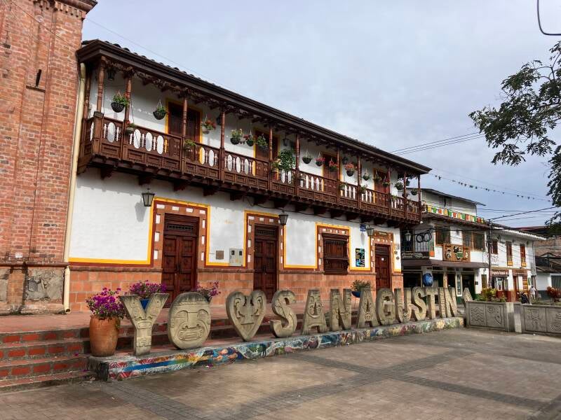 San Agustin is tot dusver het mooiste en leukste dorp van Colombia (maar ja, we zijn hier pas iets van twee weken). De huisjes zijn wit en de deuren, ramen en balustrades zijn in uiteenlopende kleuren (wel uit een uniform kleurenpallet) geverfd. Planten en bloemen op balkonnetjes en heel veel mensen: helemaal leuk. Op de plaza roept iemand 'Gutentag' en komt een praatje maken. Het is Manu, die zijn we eerder op de plaza in Mocoa tegen zijn gekomen. Hij vertelde ons toen dat hij jarenlang door Oostenrijk en Duitsland heeft gereisd en daardoor best goed Duits spreekt. Maak van dat 'best goed', maar redelijk, maar nog altijd veel beter dan ons Spaans. Carolina en Ricardo komen er ook bij staan. Ze zijn ons eerder vandaag op hun dikke BMW-motoren (hij 1250cc, zij 850cc) voorbij gereden. Wat een gezelligheid! Manu gaat weer zijn spulletjes verkopen en we kletsen een tijdje met Carolina en Ricardo. Ze zijn allebei geboren Colombianen, maar al lang woonachtig in Florida en hebben een dubbel paspoort. Ze reizen op hun motoren al een tijd door Midden-Amerika en nu zijn ze in hun geboorteland.
