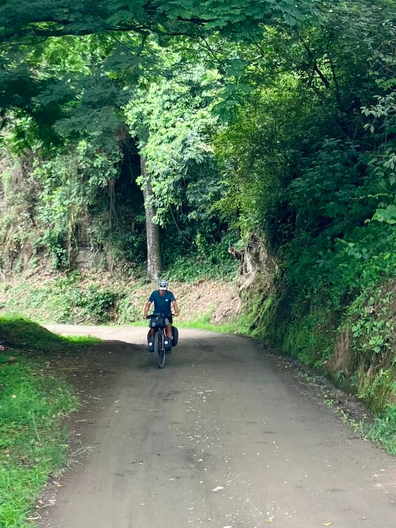 De weg was al leuk en wordt nog leuker als we een eindje over een onverhard, slingerend pad omhoog fietsen van het ene naar het andere dorp. En we houden het wonder boven wonder nog steeds droog. Jippie!