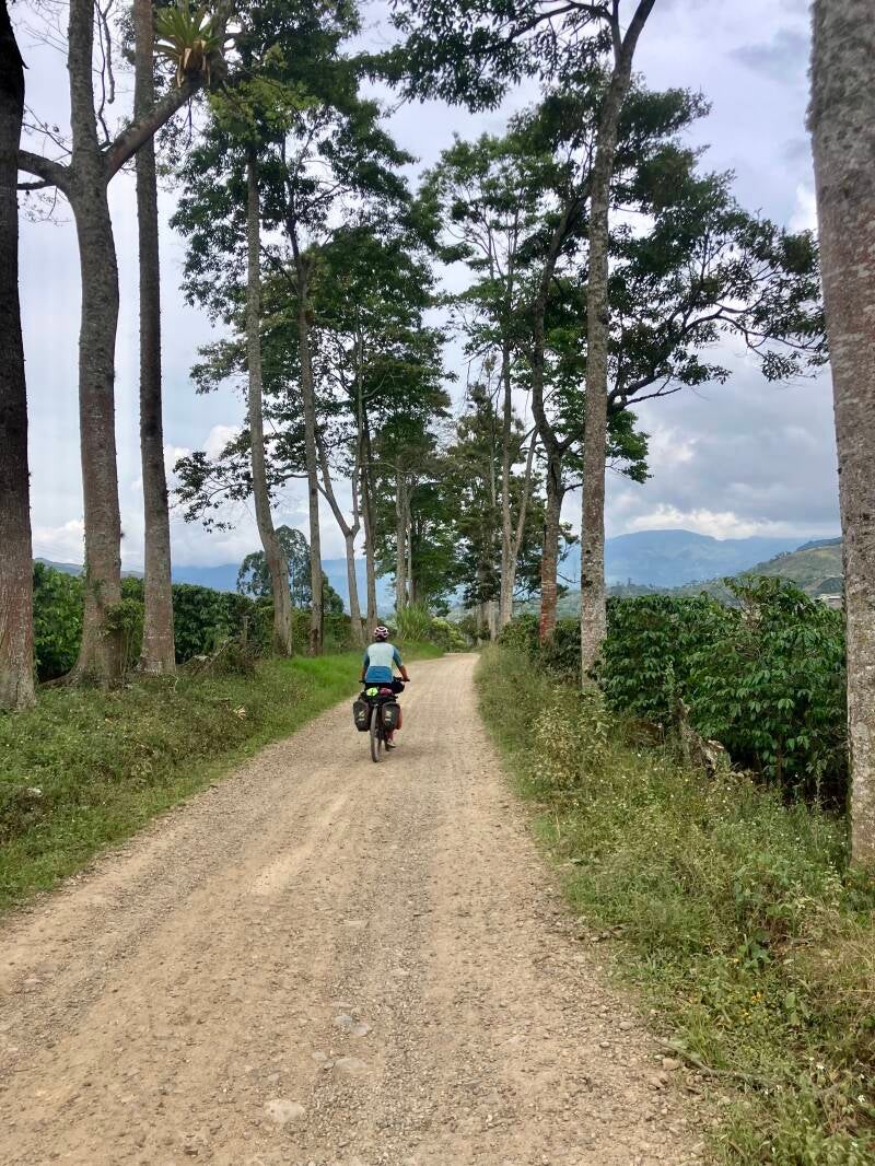 Na een tijdje mogen we de brede weg vol met wegwerkzaamheden verlaten voor een rustig mooi smal pad. Alleen scooters en motoren lijken zich op dit pad te wagen, op een enkele fourwheeldrive pick-up na. Het pad heeft het formaat van een Nederlands fietspad en wordt omzoomd door weilanden en koffievelden. Ook dit pad wordt op plekken 'begeleid' door bomen in de berm, iets wat we al best vaak in Colombia hebben gezien. Het is mooi en, niet onbelangrijk, de bomen brengen ons schaduw in de hitte. Het pad gaat eerst nog een stukje omlaag en daarna heel steil omhoog naar Oporapa. We zwoegen, maar het is mooi en op het eind van het gezweet staat vast een koud biertje voor ons gereed.