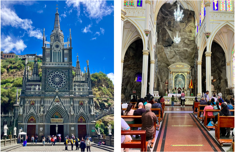 Eerste highlight en must-see ligt slechts op een kilometer of vijf van Ipiales: Las Lajas. Een paar eeuwen geleden moest een inheemse vrouw met haar dochter in de kloof schuilen voor onweer. In de kloof openbaarde Maria zich aan het dochtertje. Een beeltenis van Maria is daarbij in de kloof achtergebleven. Het bescheiden kapelletje dat daaraan herinnert, is in de jaren '30 van de vorige eeuw vervangen door een neo-gotische kerk, of beter basiliek, van formaat. De locatie van de basiliek is bijzonder: de achterwand van het koor is de rotswand en het portaal hangt als het ware boven de kloof. Als we vanaf de weg de basiliek zien liggen, lijkt die ons toch bijzonder genoeg om van dichtbij te bekijken. De straatjes naar de basiliek zijn afgeladen vol met kraampjes met souvenirs, kaarsen en containers om heilig water in mee te kunnen nemen. De omgeving hangt vol met devotie tegels en -tegeltjes, waarmee men hoopt -naar wij aannemen- een plekje in de hemel te reserveren. 's Avonds wordt de kerk verlicht door een soort lichtshow met felle kleuren. Daar wachten we niet op; het is vroeg in de ochtend en we fietsen verder.