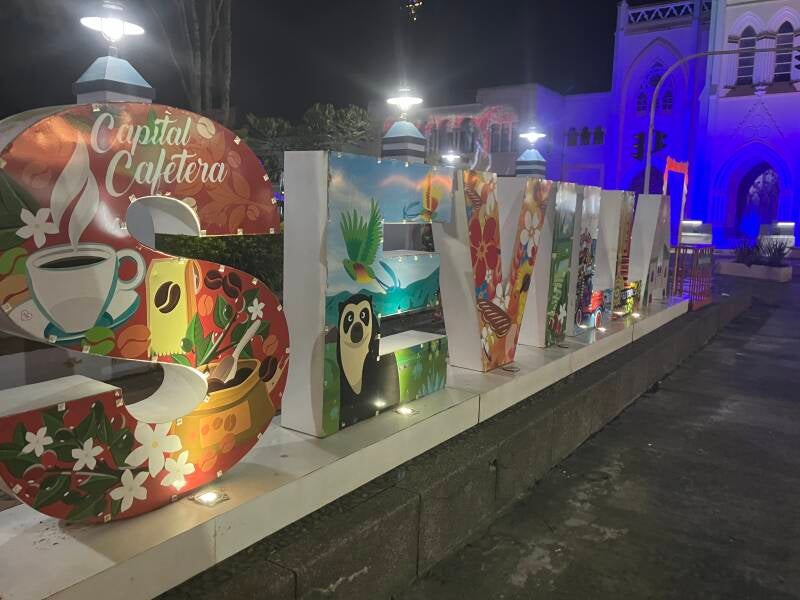 Op het bordes naast de kerk In Riosucio vinden we het terrasje van een koffietentje. De buren aan het tafeltje naast ons hebben een prachtig drankje besteld en we bestellen gewoon hetzelfde zonder te weten wat het is. Het ziet er niet alleen heel erg lekker uit, het is ook echt hemels. In de middag genieten we van een vrije middag op het dakterras van het hotel met een weids uitzicht over het stadje en de omliggende bergen. 's Avonds is het versierde plein voor de kerk mooi verlicht en vinden we in een zijstraatje een serie restaurantjes die de terrassen op straat hebben staan. De straat is afgesloten voor verkeer. Wat verassend leuk is Riosucio.