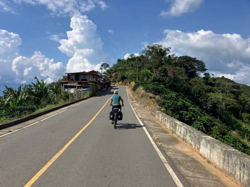 De dorpen in dit gebied hebben veelal 'Europese' namen: Barcelona, Cordoba, Sevilla, Génova, maar ook Cartago en Palestina. Na een tijdje cruisen moeten we toch echt aan de bak. Er volgt een klim van tien kilometer naar ons dagdoel van vandaag: Pijao. Die klim doen we zonder enige onderbreking, althans: we proberen één keer te pauzeren en worden meteen opgevreten door die minuscule klote sandflies. De sandflies veroorzaken niet alleen een irritante jeuk gedurende vijf dagen, ze zijn ook berucht als ziekte overbrengers. Door dus!