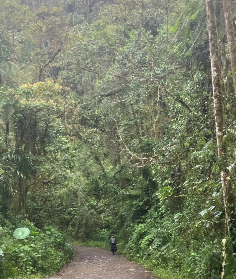Het duurt lang voordat we de top bereiken, we zijn dan al zes uur onderweg. Niet voor de eerste keer fietsen we net voor de top de wolken en de regen in. Tijdens de afdaling gaat het steeds harder regenen en dat houdt de hele afdaling aan (en die is lang!). Ondanks dat we in de wolken zitten, zien we hoe mooi en uniek de omgeving is. Het pad voert ons door een dicht regen- en/of nevelwouden het aantal watervallen is niet op twee handen te tellen. Het is op dit onbekende pad zoveel mooier dan op die beroemde 'Trampoline de la Muerte' van een maand terug en die zowat elke fietser wilt doen. Onze handen zijn kletsnat en verkleumd en die van Harry inmiddels alweer compleet gevoelloos en onze 'geavanceerde' iPhones herkennen dan onze vingers niet meer en regeren ook niet meer als we de toegangscode op het touch screen willen invoeren. Maar één keer lukt het Roelie om een foto te maken. We begrijpen inmiddels de de 'i' van iPhone staat voor 'irritant'.