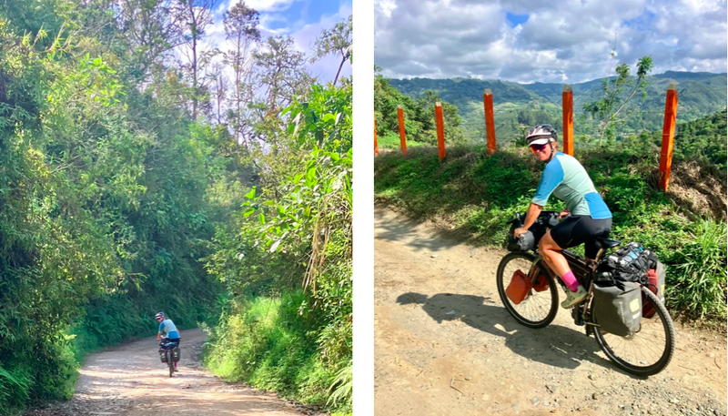 De eerste etappe heeft nog wel wat om het lijf: (uiteindelijk) 40 kilometer en 1000 hoogtemeters. Roelie heeft weer een voormalig spoorlijntje gevonden en door ervaringen wijzer geworden, plegen we (weer) extra recherche naar de route. Op satellietbeelden zien we langs het hele traject huisjes liggen, dus dit moet toch wel zeker een begaanbaar weggetje zijn? Er zou een spoorbrug in het traject zitten, waar je lopend overheen zou moeten. Oké leuk. Zo gepland, zo gedaan. Of niet. We dalen af over een fijne geasfalteerde en best rustige weg voordat we scherp afbuigen en het spoorlijntje opfietsen.
