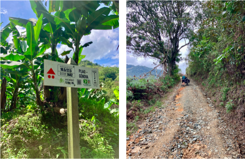 Buiten Pijao zien we een MTB routebord staan. Kijk wat leuk, we gaan een MTB-route fietsen! Wat is dit te gek, wat is het hier mooi! Die euforie duurt zolang de afdaling duurt.