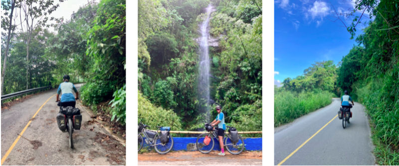 Het regent lichtjes en dat maakt het eigenlijk best aangenaam. We gaan een stuk over een grote hoofdweg fietsen en waar we normaal altijd een beetje huiveren bij het verschil in snelheid, is dat bij Perreira geen enkel probleem. Het staat namelijk hartstikke vast op de ringweg rond de stad en we kunnen elke keer een gaatje vinden om er door te kruipen. Even na de stad komt het verkeer weer op gang en hebben we een brede vluchtstrook om op te fietsen. Geen steile stukken meer, maar rustig afdalen. We cruisen! Na 13 kilometer doen we heel even een klein stukje van de grote weg af en door het bos om dan vervolgens weer op een drukke weg te komen waar bijna geen vluchtstrook meer naast ligt. Gelukkig nog steeds alles naar beneden en zo vliegen we toch rap richting La Virginia..