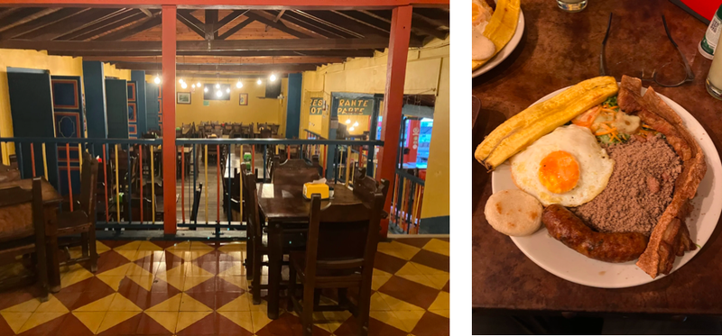 Uiteindelijk bereiken we Fredonia. Ook wel een aardig dorp maar om het centrale plein te bereiken mogen we nog even een stuk achterlijk steil (ca 20%) klimmen.Het plein is volledig afgezet omdat het heringericht wordt. Toch zijn er nog een paar terrasjes en op eentje daarvan drinken we ons welverdiende ijskoude biertje. Fredonia is erg levendig, oftewel erg druk. Het heeft meerdere hotels en restaurants, maar het lijkt het allemaal net niet te zijn. Restaurants sluiten om 8 uur, opschieten dus. De eerste, een chinees is om zeven uur al dicht. Een andere heeft honderden reviews, het is groot en we verbazen ons dat we de enige gasten zijn. We bestellen een Bandeja Paisa: een typisch Colombiaans gerecht oftewel vertaald een dienblad vol met calorieën (bonen, gehakt, chorizo, een enorm stuk uitgebakken spek, banaan, ei, rijst, arepa en... zowaar een klein beetje sla).
