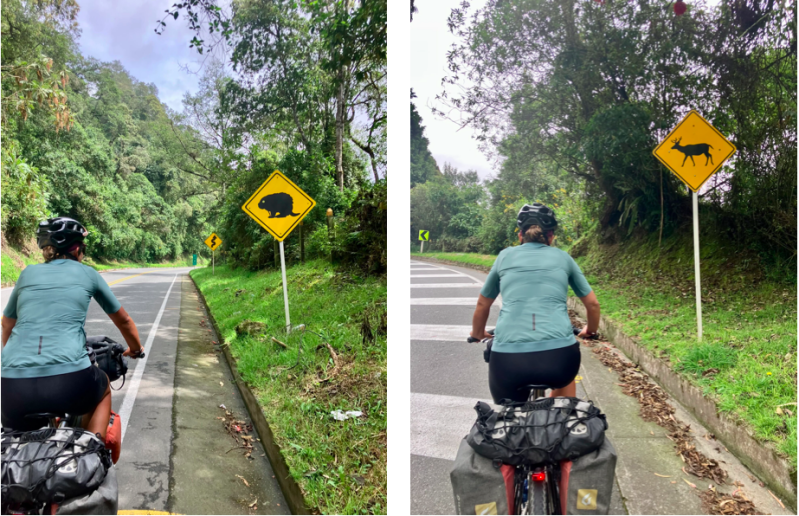 Na Barbosa begint weer het serieuze klimmen. We vertrekken vroeg omdat het veel hoogtemeters en veel kilometers gaat worden om San Rafael te bereiken. Daar woont de eigenaar van de AirBnB in Medellin en we zijn welkom bij hem. We moeten eerst nog een klein stukje terug fietsen en zien dan de weg omhoog waar we gisteren nog lekker aan voorbij konden sjezen. Nu niet. In Trailes jongere jaren is ze professioneel wielrenster geweest. Dat ze nu de oudste van dit team is, blijkt geen rol te spelen en ze fietst als een speer omhoog. Harry kan haar wel makkelijk volgen, maar hij blijft meestal bij zijn vrouwtje fietsen. Onderweg komen we waarschuwingsborden tegen voor overstekende apen, die gevolgd worden door een 'ecoduct': een apenbrug boven de weg, maar steeds zonder apen.