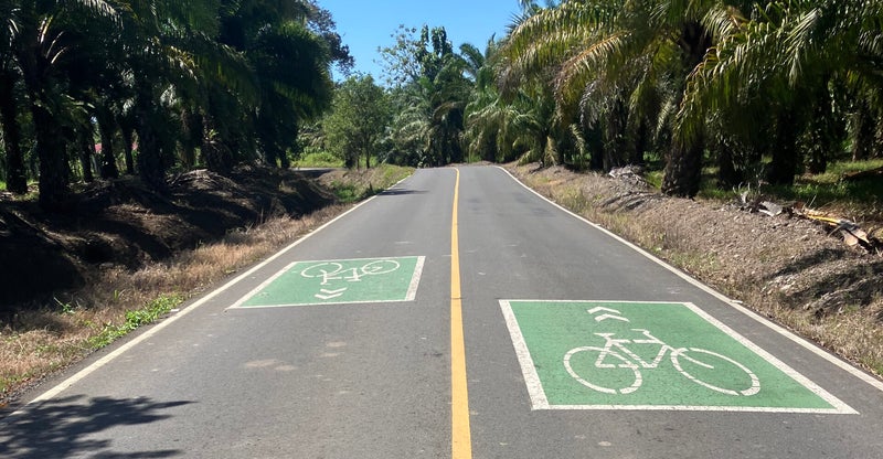 We hebben onze zinnen gezet op een 'Zwitserse' camping op een kleine honderd kilometer van Uvita. We hebben in noord Peru een heerlijke tijd gehad op de camping Swiss Wasi (ook dus van Zwitsers) en dat beeld nestelt zich in ons hoofd. Nu we een aardige proef hebben doorstaan, willen we graag weer kamperen. De eerste helft van de etappe is prima: weinig verkeer, koel en wat hoogteverschillen en bochten. De tweede helft is echter een stuk minder: heet, druk, geen vluchtstrook, lange kaarsrechte stukken. Stampen maar. Pas de laatste 3,5 kilometer zijn weer even leuk. We zijn van de hoofdweg afgeslagen op weg naar de camping en komen zowaar op een mooi fietspad terecht tussen de palmolie plantages.