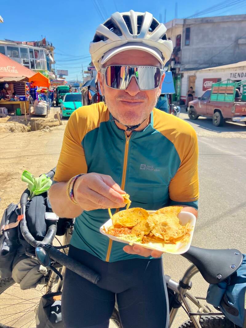 In het dorp Godinez heerst weer een heerlijke chaotische drukte. We kopen bij een straatverkoper een beker met fruit en hebben dan nog meer trek. Bij de buurman kopen we een tortilla met vlees en aan Harry's gezicht kun je wel aflezen of hij het lekker vindt.