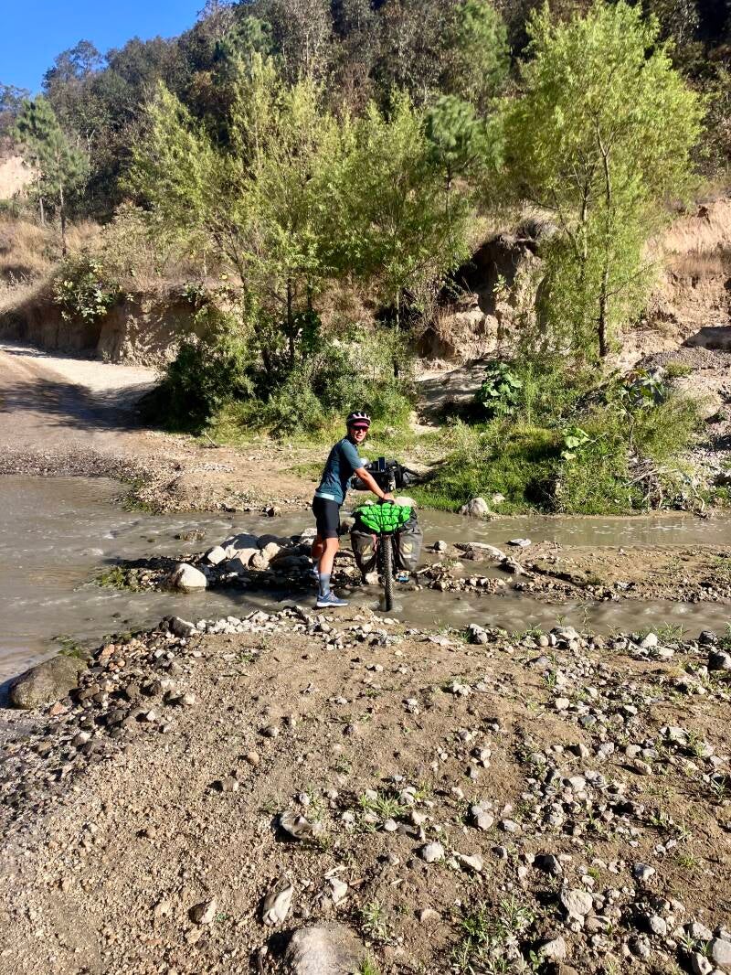 Het mooie asfalt is op één plek weggeslagen door een rivier. Een vrachtwagentje zien we diep wegzakken en we besluiten over de keien naar de overkant te lopen. Als we aan de andere kant zijn komt er een personenwagen die de route op links pakt en daar is het water helemaal niet diep. We hadden er gewoon doorheen kunnen fietsen.