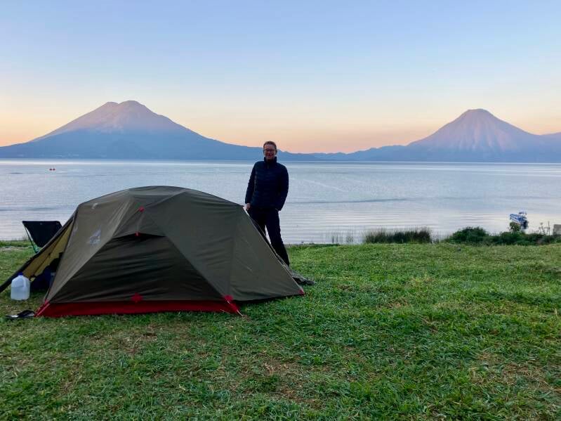 Panajachel is een toeristisch dorp en heeft een hele reeks fancy koffietentjes. Wij komen terecht bij Loco Café en na een eerste gouden beker met iced cappuccino bestellen we gewoon een tweede beker met precies hetzelfde. Lekker, heel lekker! Daarna fietsen we door naar een hotel waar we volgens iOverlander een tent mogen opzetten al vragen ze daar volgens de reviewers wel iets teveel voor. Volgens de laatste berichten is dat 100 Q (€12) per persoon voor tentkampeerders als wij. De dame bij de receptie lacht heel vriendelijk en gaat een collega bellen om navraag te doen wat het kost. Roelie denkt dat ze het niet goed verstaat en dat ze geen 250Q maar 50Q per persoon doorgeeft, maar dat is niet zo. Ze bedoelt toch echt 250Q per persoon. Een nachtje kamperen in een tentje voor twee personen zou dan meer dan €60 kosten. WAT? Echt? Ja echt. Oké, gelukkig is er een camping iets verderop en daar vragen ze 100Q per persoon voor, nog steeds vrij prijzig, maar daar krijg je dan wel een zwembad en met name een fantastisch uitzicht op het meer en de twee (eigenlijk drie) vulkanen aan de overkant voor terug. We zetten onze tent neer op een mooie plek op de eerste rang aan het Atitlan meer. Links van ons staan al een handjevol overlanders van verschillende pluimage: twee luxe omgebouwde vrachtwagens, een bestelbus met de laadbak naar benden als veranda en glasachterwand, een antiek verroest VW-busje, een pick-up met opzet kampeer-'huisje' en een 4x4 met daktent. Later zetten een niveautje lager en rechts van ons Guatemalanen, met wisselende vaardigheid, hun tentjes op. Het is zaterdagavond en een kampeerweekendje lijkt hier wel populair te zijn. Achter ons parkeren twee Duitse jonge dames een Oostenrijkse 4x4 zonder daktent.