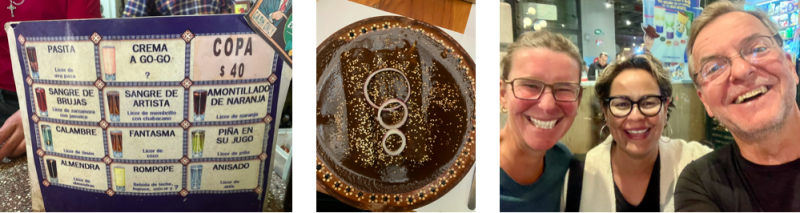 Op zondag struinen we wat door het centrum, bezoeken kathedraal en een paar kerken (helaas niet van binnen, omdat er aan de lopende band diensten gaande zijn) en de antiek markt, een tip van Anilu. De derde dag in Puebla doen we het nog rustiger aan: Harry doet zelfs een middagdutje terwijl Roelie al de elektronische formulieren invult om ergens eind mei te worden toegelaten in het beloofde land van Trump. Tegen het eind van de middag nemen we nog een kijkje in de kathedraal: het interieur is gigantisch, imposant en 'over-de-top' tegelijk. 's Avonds hebben we weer met Anilu afgesproken voor een drankje en diner. Anilu doet mee met het drankje, maar eet niets. Ze vertelt dat voor 'de' Mexicaan de belangrijkste maaltijd 's middags om drie uur is. We begrijpen dat ze om zes uur nog geen trek heeft. Het drankje wordt een Pasita, een traditioneel druivenlikeurtje met een stukje kaas aan een prikker erin. En als diner kiezen we ook een traditioneel gerecht uit Puebla: enchiladas (gevuld met kip) met een mole Poblano van chocolade, sesam, noten en chilipepers. Het is bijzonder en best lekker, maar voor ons geen culinair topgerecht.